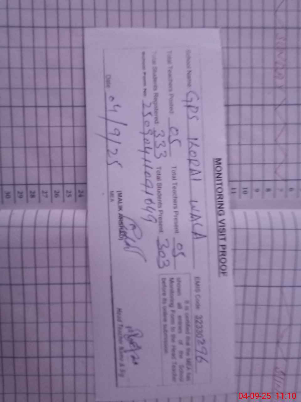 | Attendance Register | Head Teacher | MEA with School | Visit Proof |