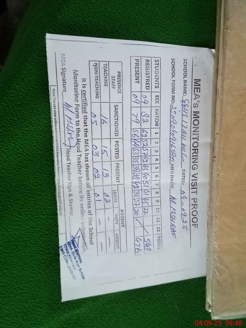 | Attendance Register | Head Teacher | MEA with School | Visit Proof |