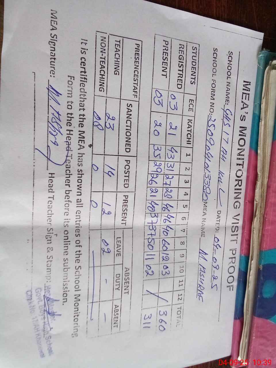 | Attendance Register | Head Teacher | MEA with School | Visit Proof |