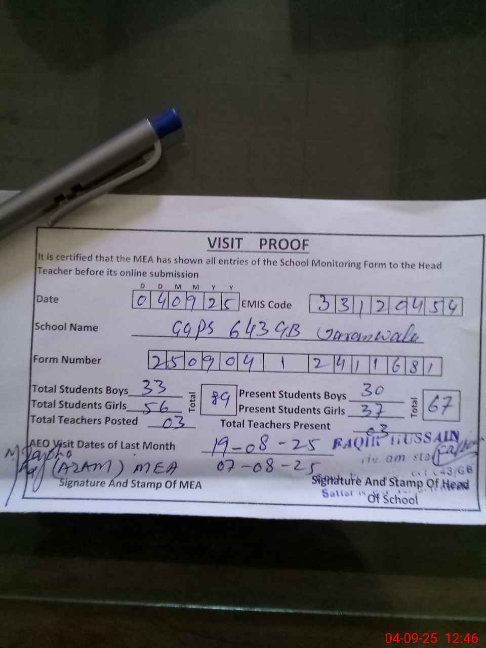 | EMIS Code: 33120454 | Name of School: GGPS CHAK 643 GB LUNDIANWALA | |||