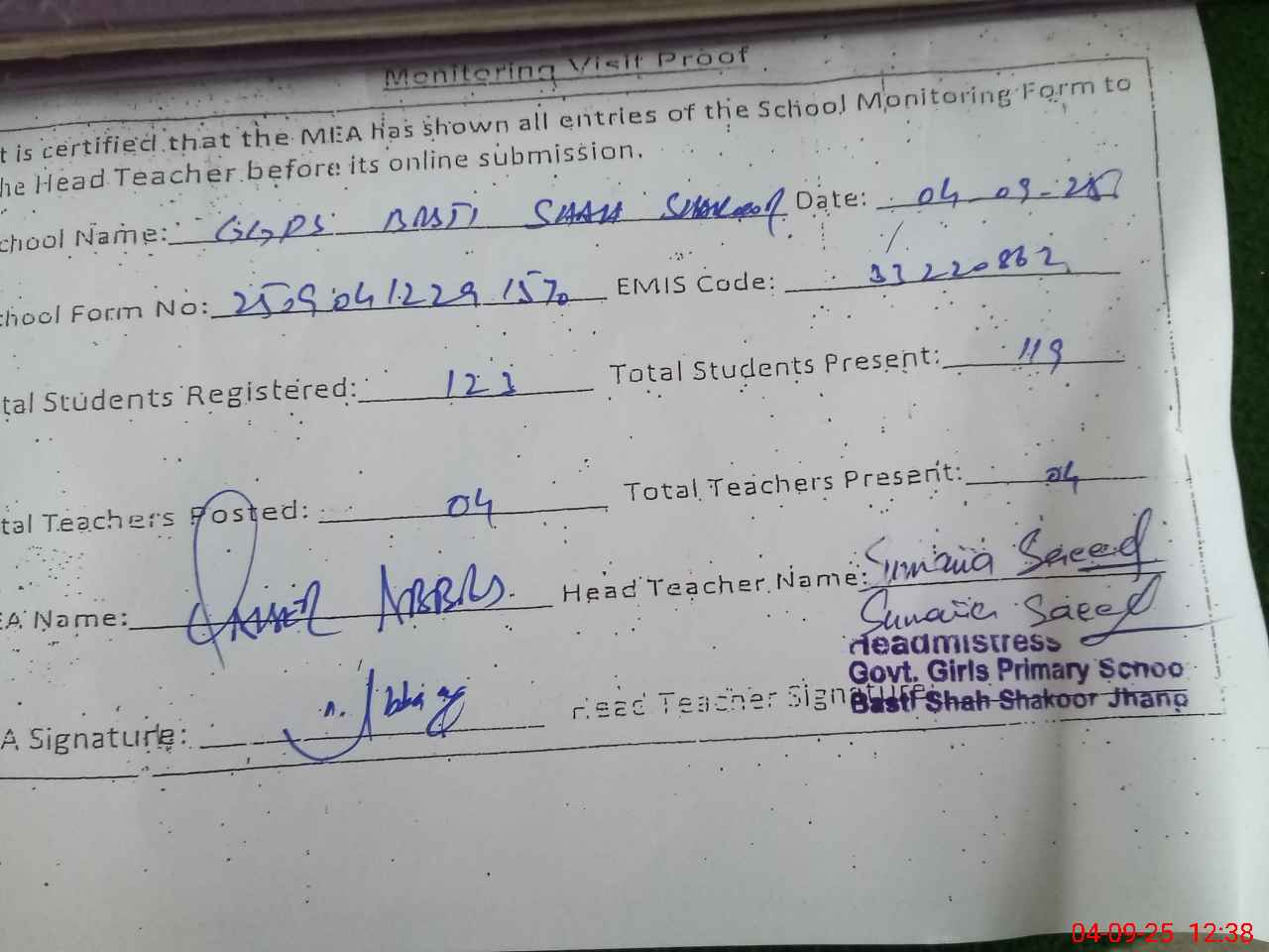 | EMIS Code: 33220862 | Name of School: GGPS BASTI SHAH SHAKOOR | |||