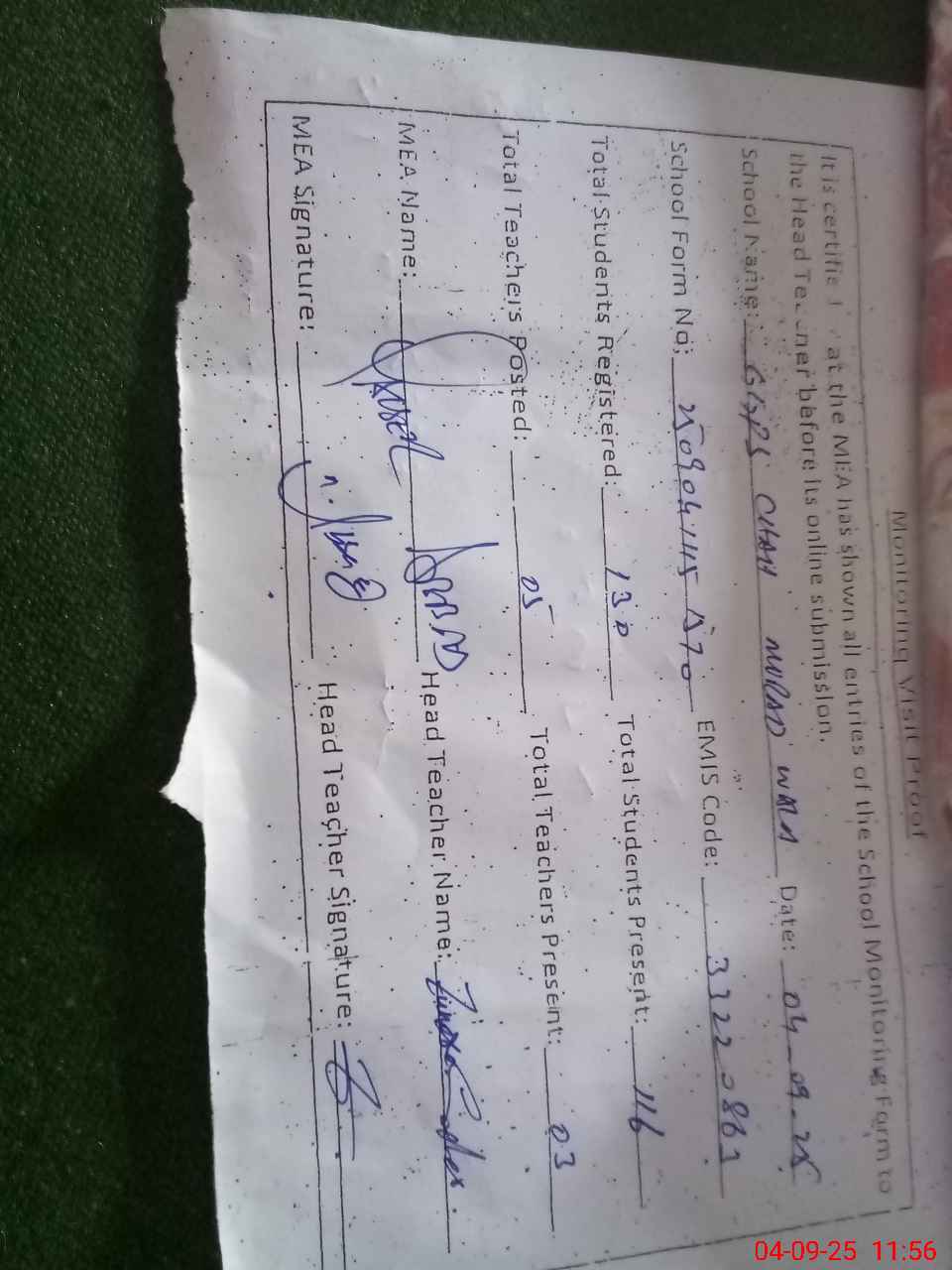 | Attendance Register | Head Teacher | MEA with School | Visit Proof |