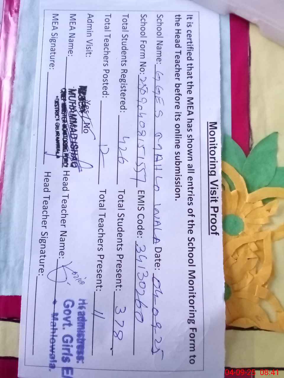 | Attendance Register | Head Teacher | MEA with School | Visit Proof |