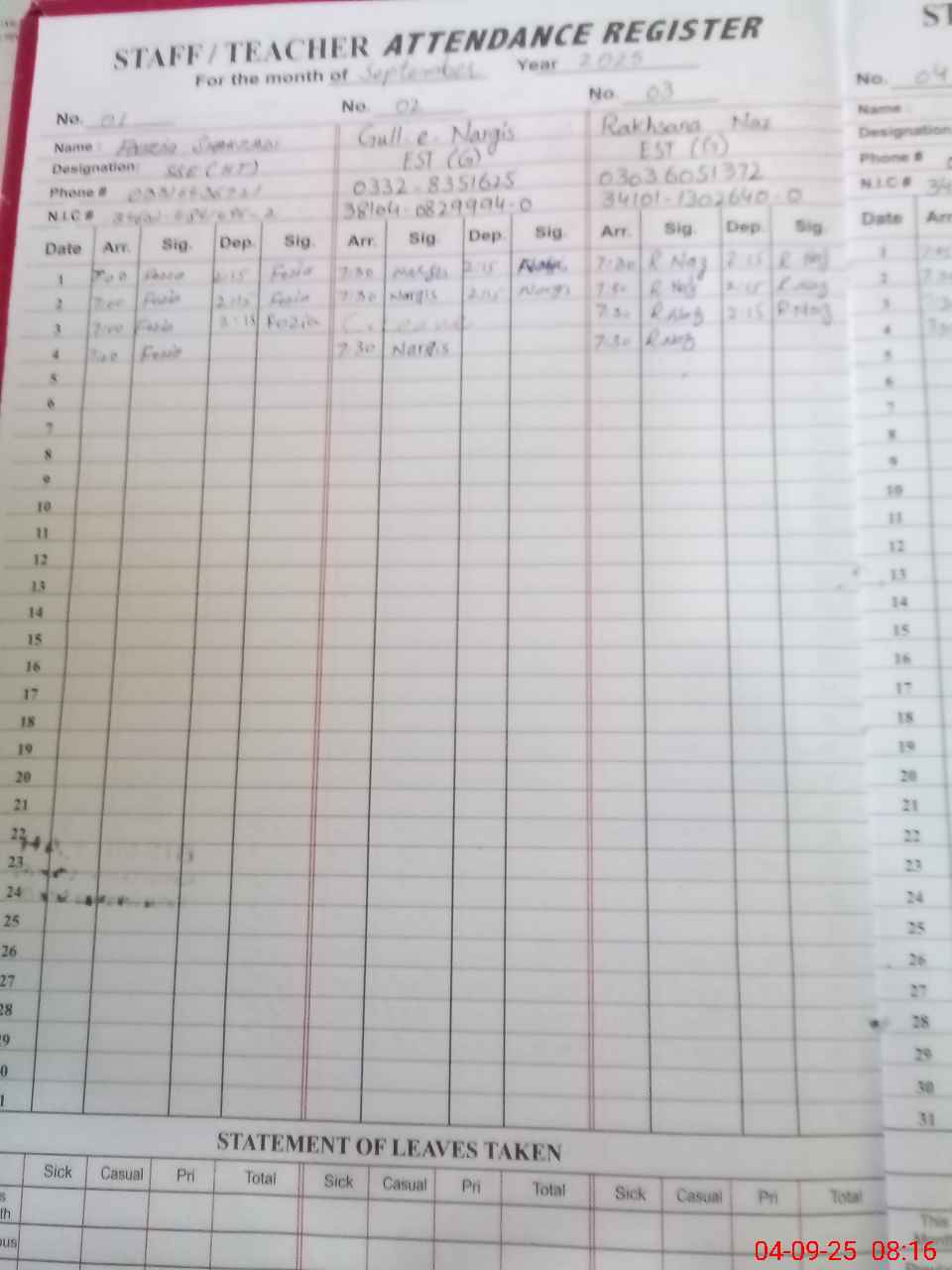 | CNIC | Full Name | Designation | R/C | Absence During Last Calender Month |