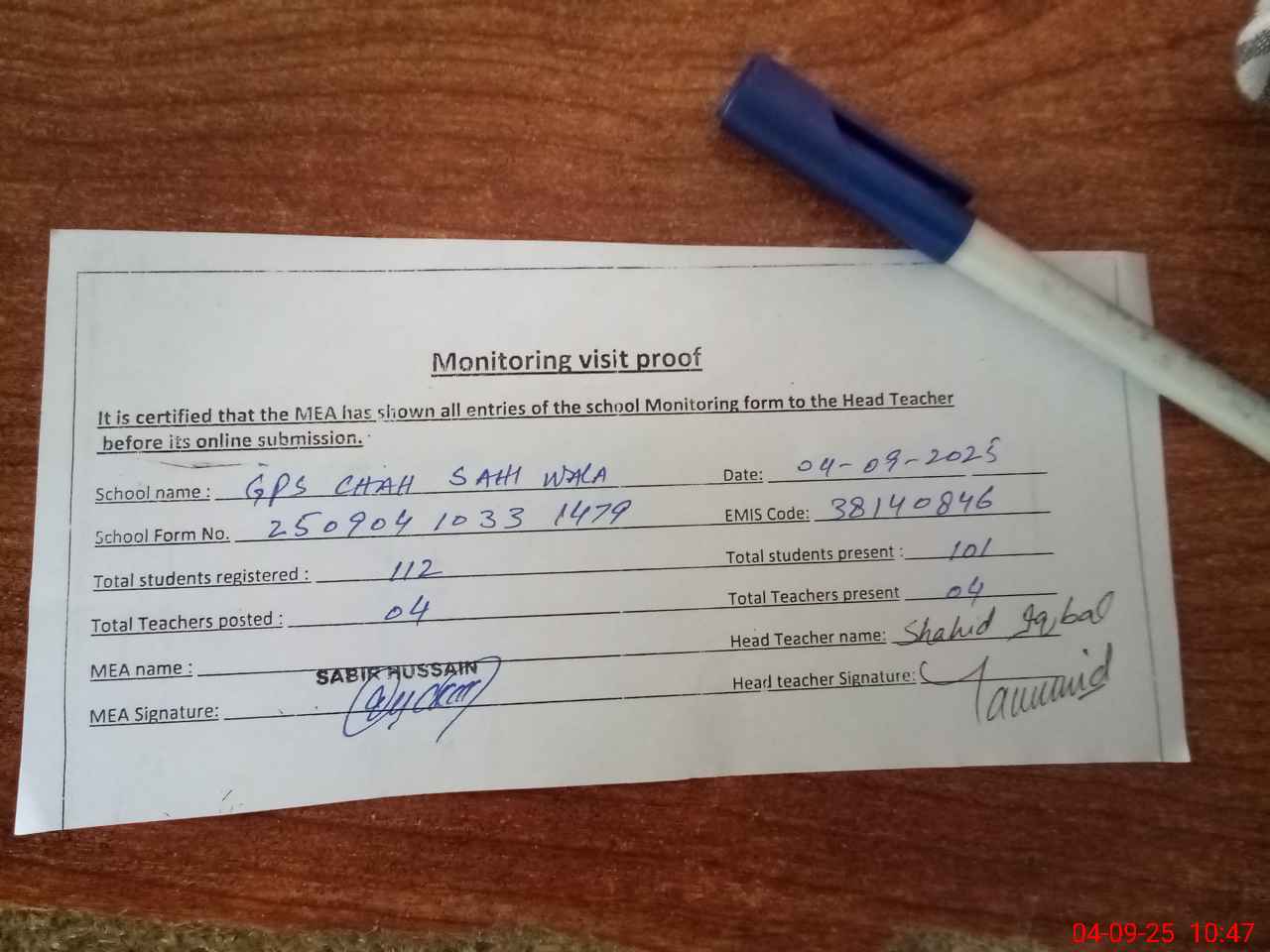 | Attendance Register | Head Teacher | MEA with School | Visit Proof |