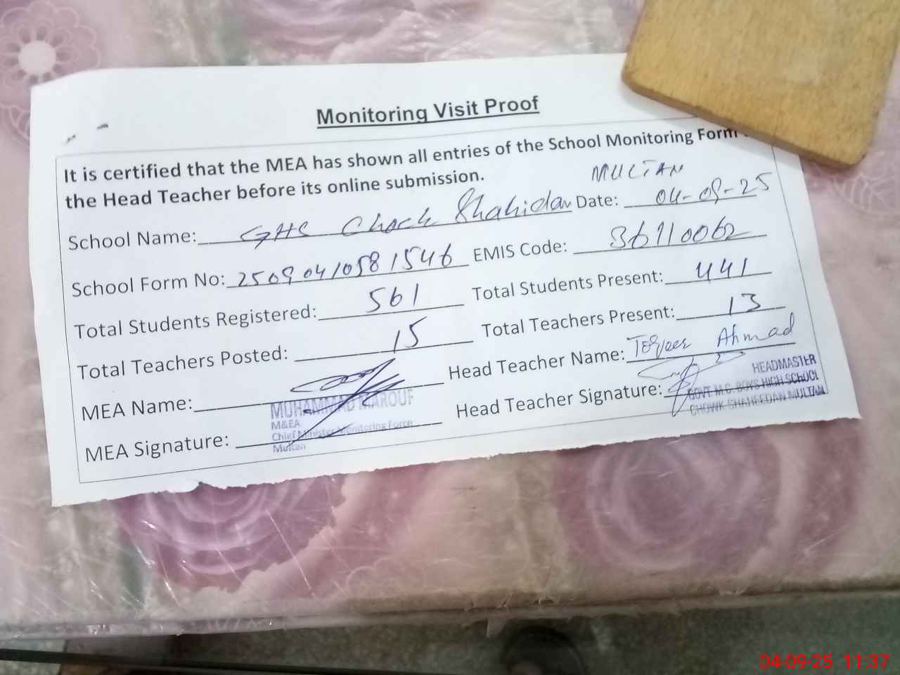 | EMIS Code: 36110062 | Name of School: GHS MC CHOWK SHAHIDAN MULTAN | |||