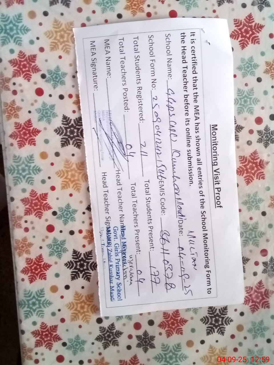 | Attendance Register | Head Teacher | MEA with School | Visit Proof |