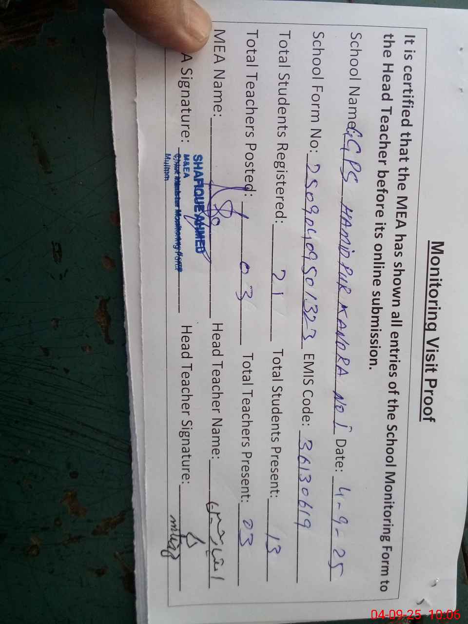 | EMIS Code: 36130619 | Name of School: GGPS HAMID PUR KANORA NO 1 | |||