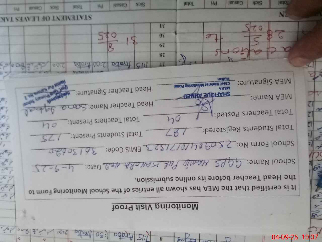 | Monitoring Date: 04-09-2025 | Start Time: 04-09-2025 10:17 AM | End Time: 04-09-2025 10:37 AM | Name of MEA: SH**** AH**** | |