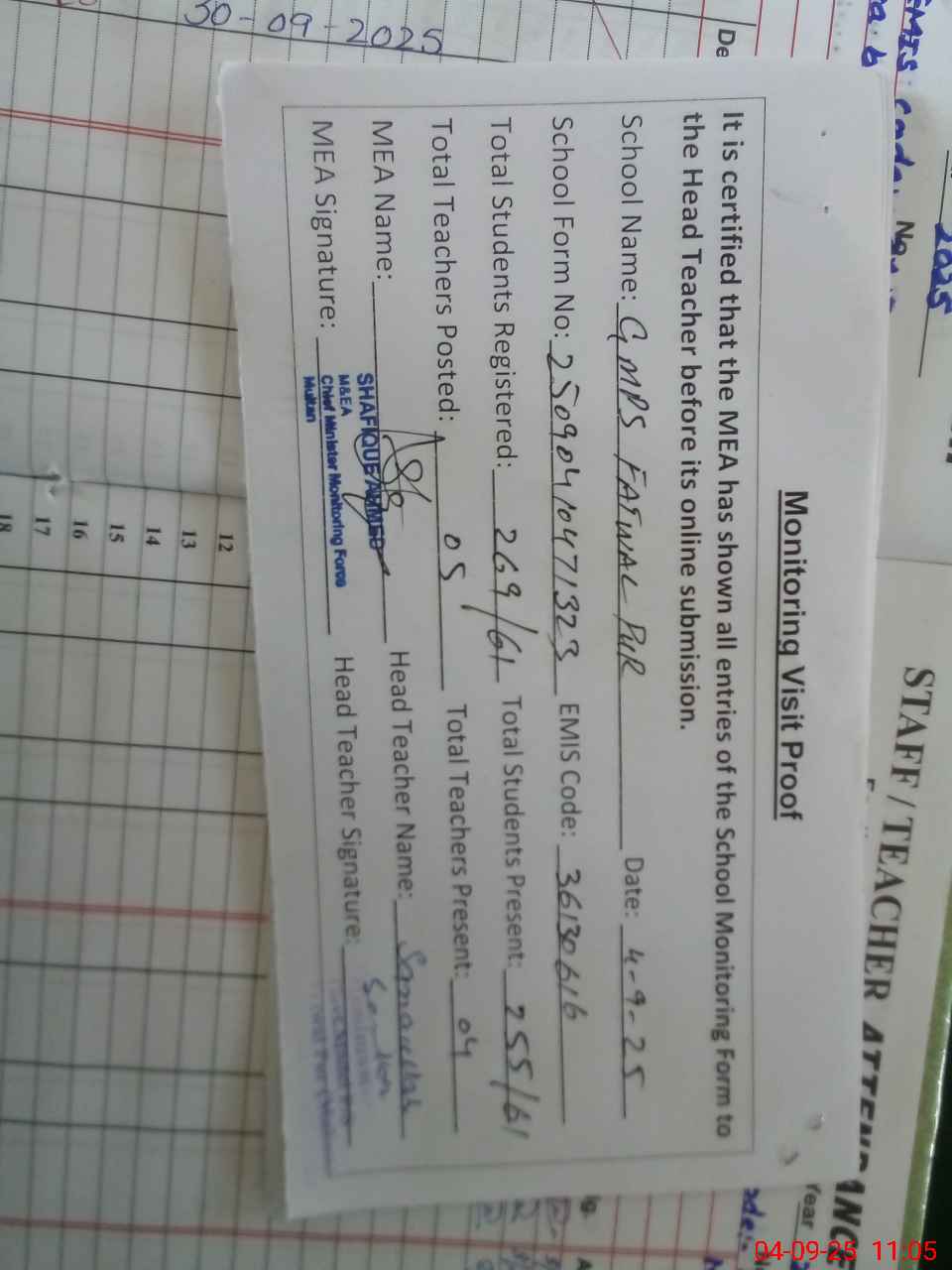 | Attendance Register | Head Teacher | MEA with School | Visit Proof |