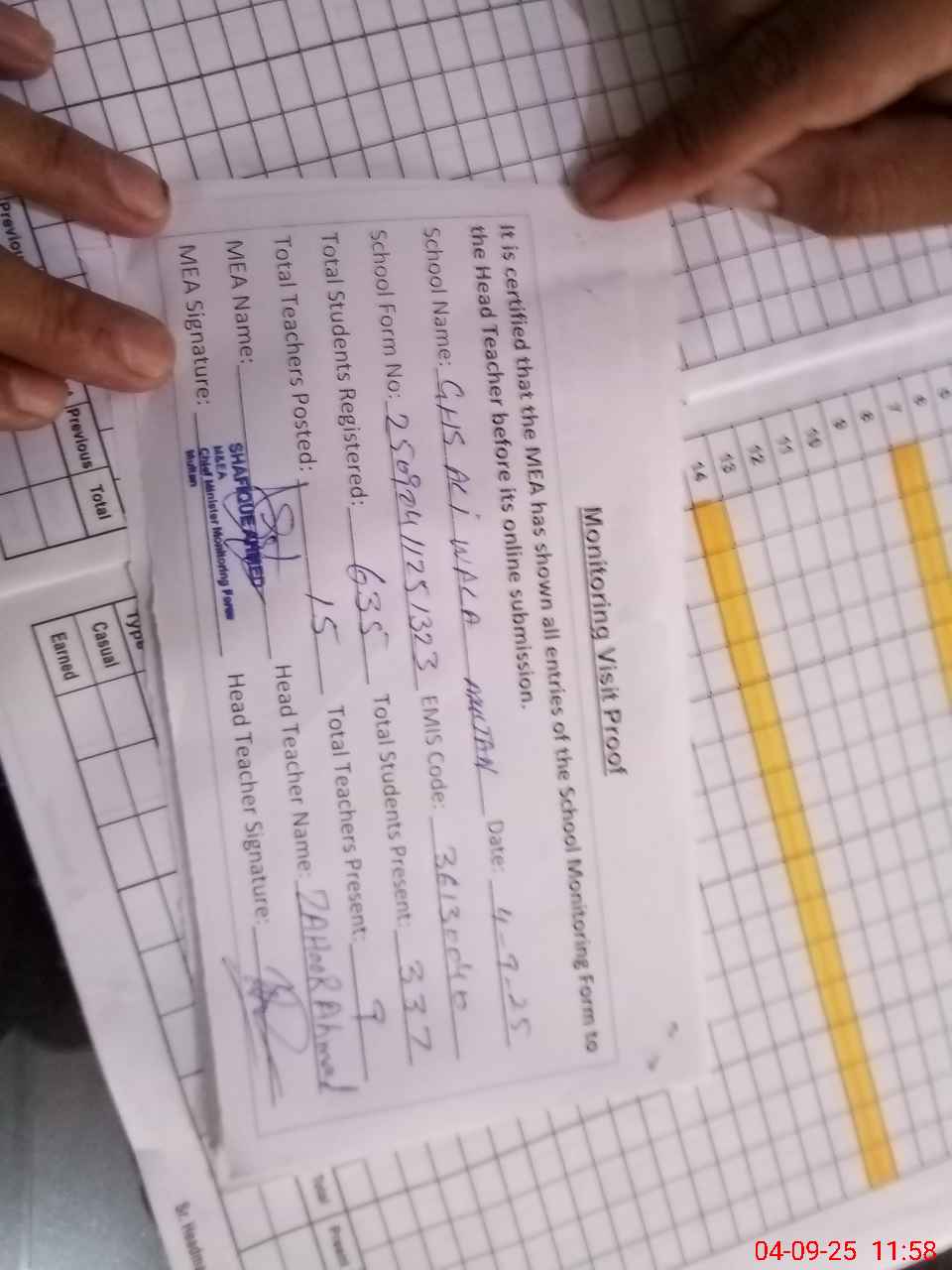 | Attendance Register | Head Teacher | MEA with School | Visit Proof |