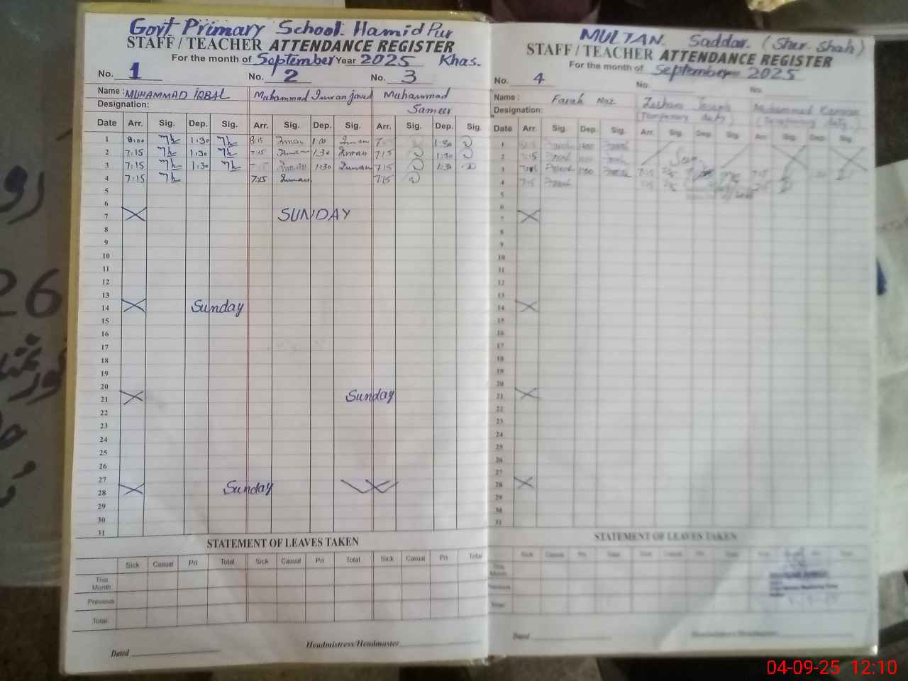 | Remarks (Use Separate Page if Required): PST ZEESHAN JOSEPH from GPS HAMMAD PUR and PST MUHAMMAD KAMRAN from GPS RAJA PUR are present in school | |||||