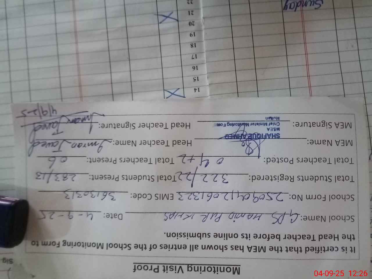 | Attendance Register | Head Teacher | MEA with School | Visit Proof |