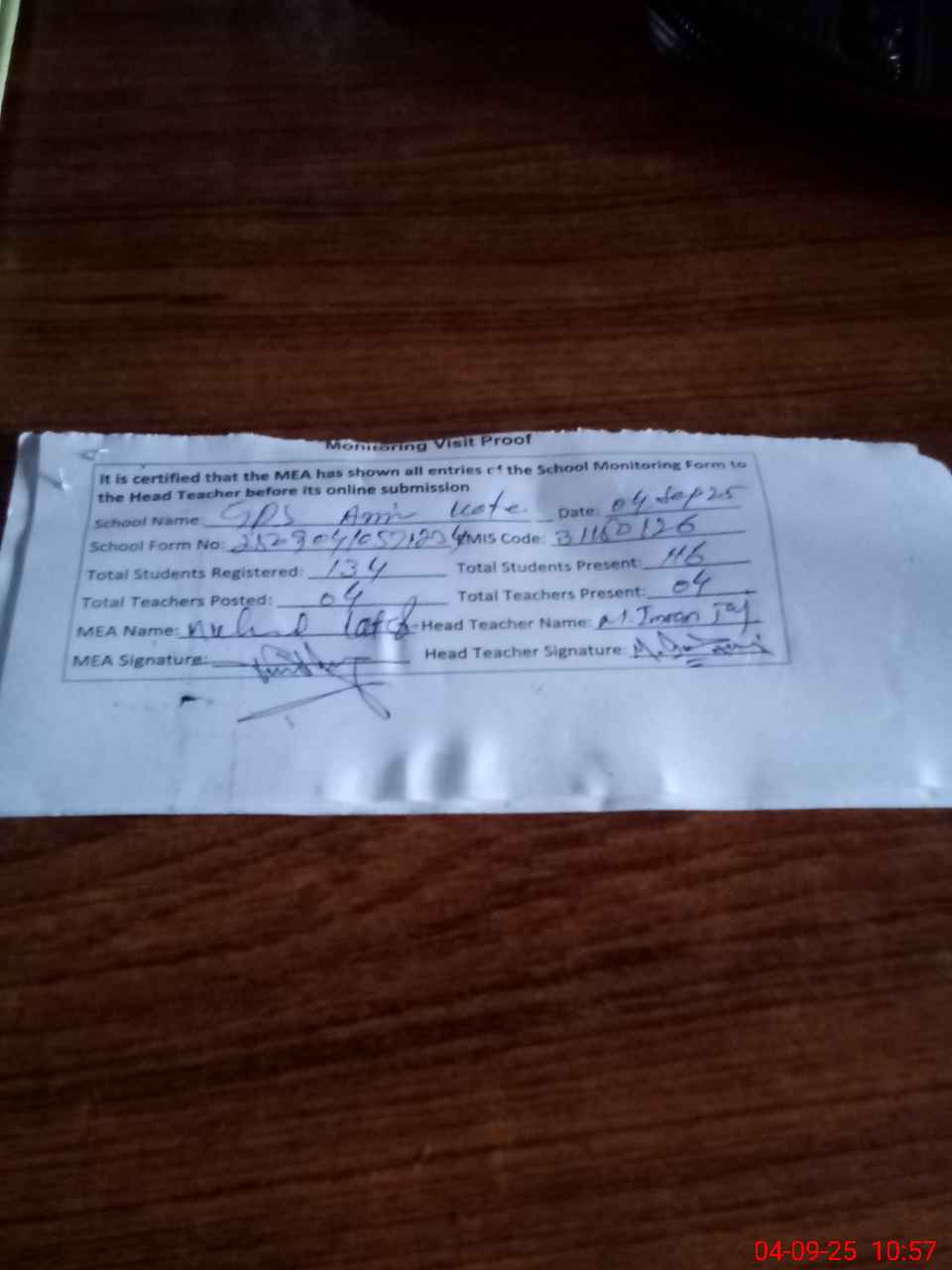 | Attendance Register | Head Teacher | MEA with School | Visit Proof |
