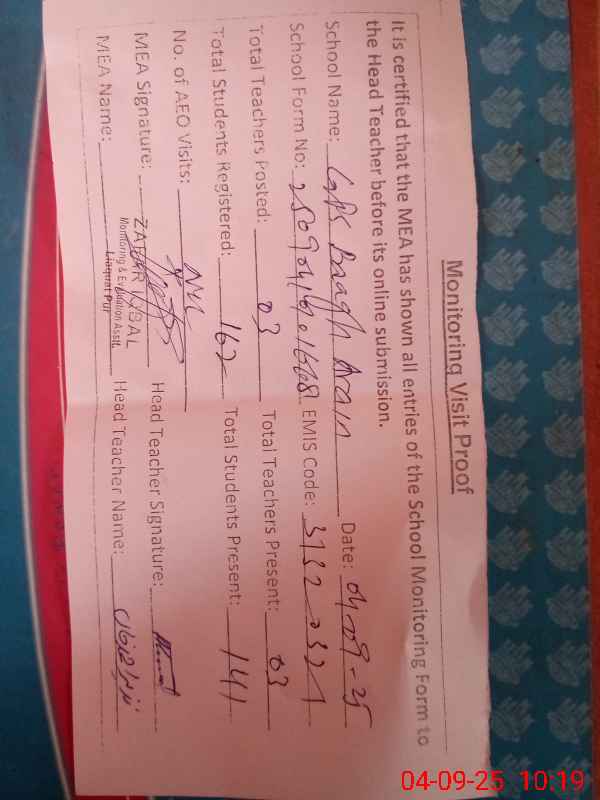 | EMIS Code: 31320321 | Name of School: GPS BAAGH ARAIN | |||