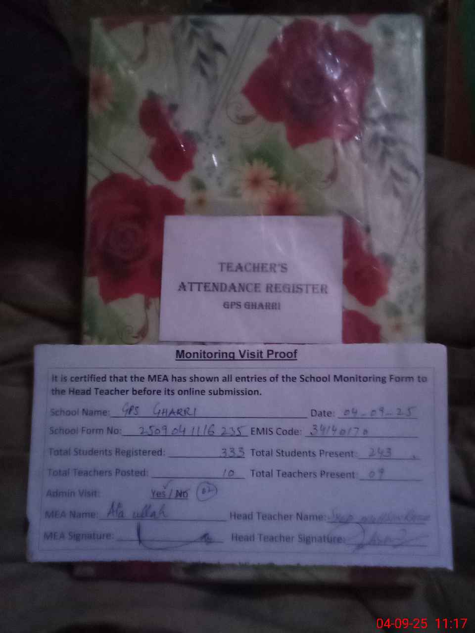 | Attendance Register | Head Teacher | MEA with School | Visit Proof |