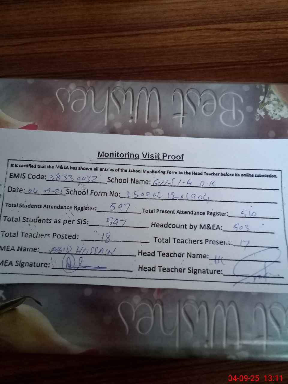 | Attendance Register | Head Teacher | MEA with School | Visit Proof |