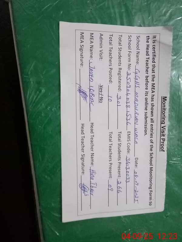 | EMIS Code: 34130033 | Name of School: GGHS MADHRIAN WALA KALAR | |||