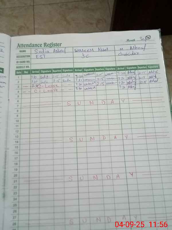| CNIC | Full Name | Designation | R/C | Absence During Last Calender Month |