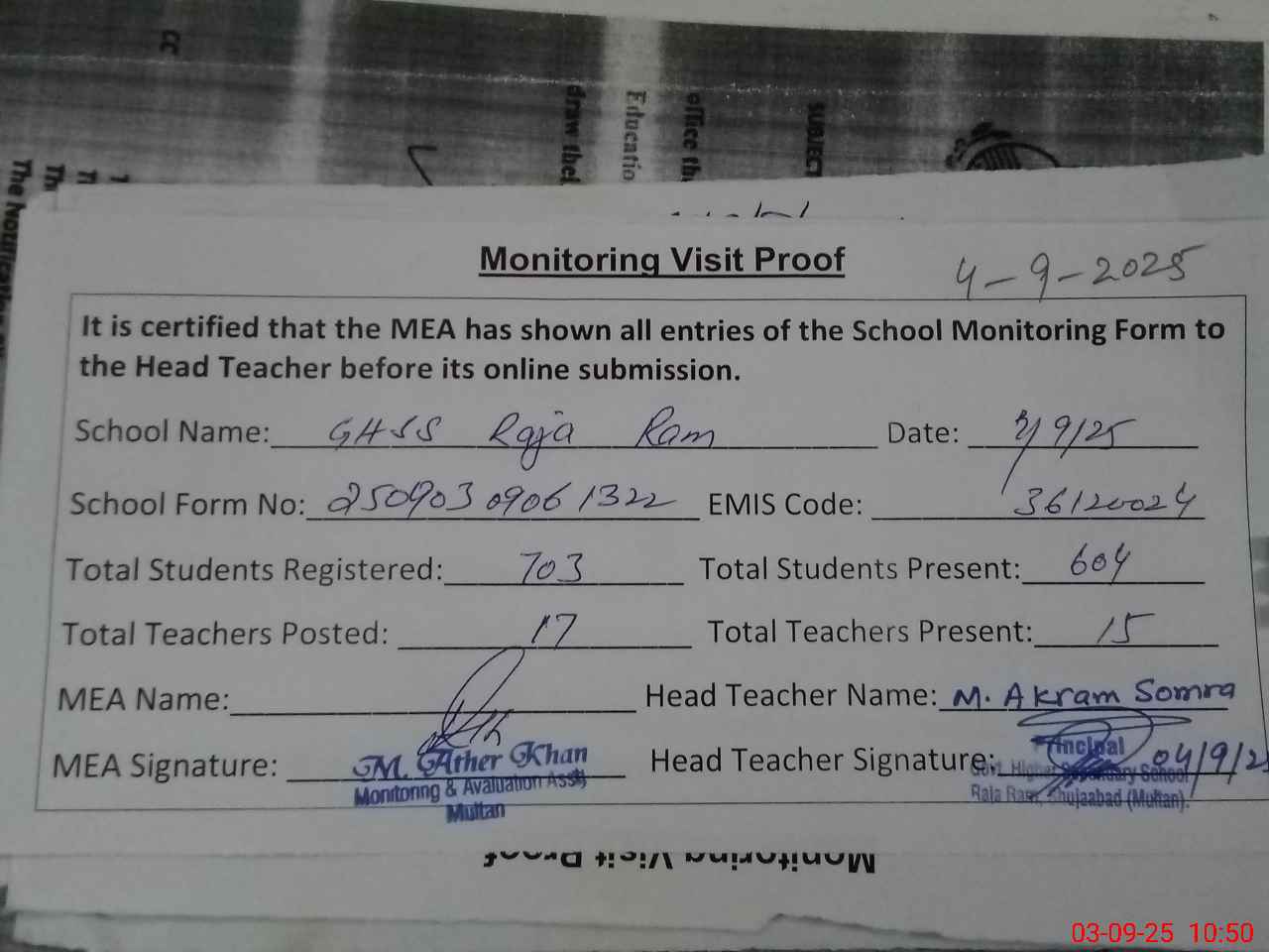 | Attendance Register | Head Teacher | MEA with School | Visit Proof |