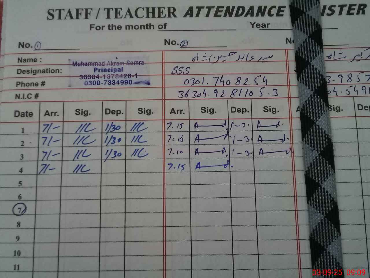 | Name: SA**** AB**** HU**** SH**** Designation: (School Headmaster's/Headmistress's) IN CHARGE SSS ARABIC Phone/Cell Number: 03**** |