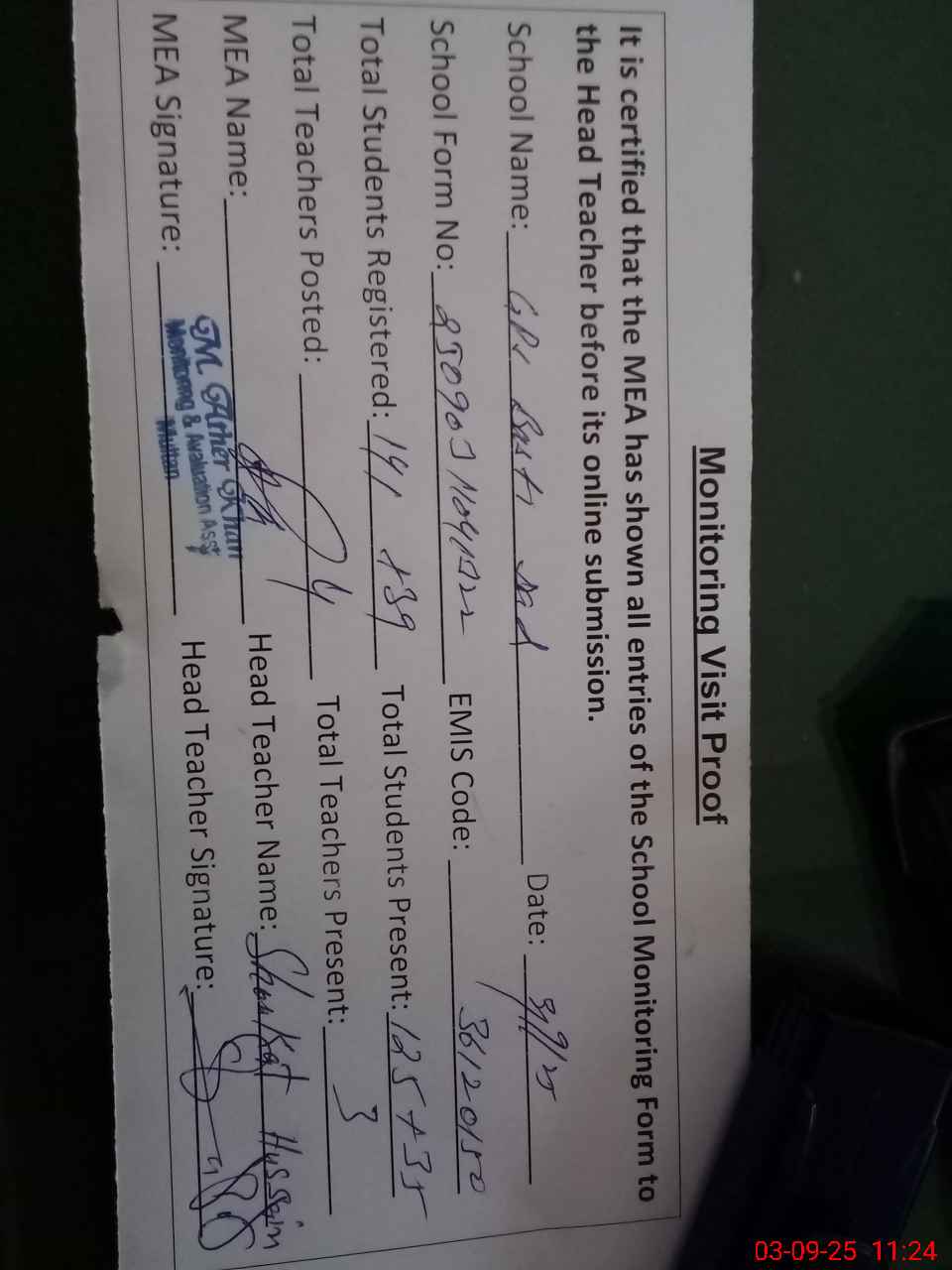 | Attendance Register | Head Teacher | MEA with School | Visit Proof |