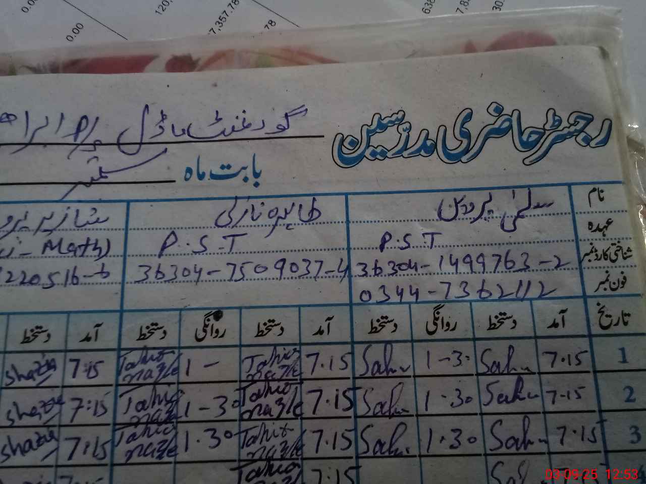 | CNIC | Full Name | Designation | R/C | Absence During Last Calender Month |
