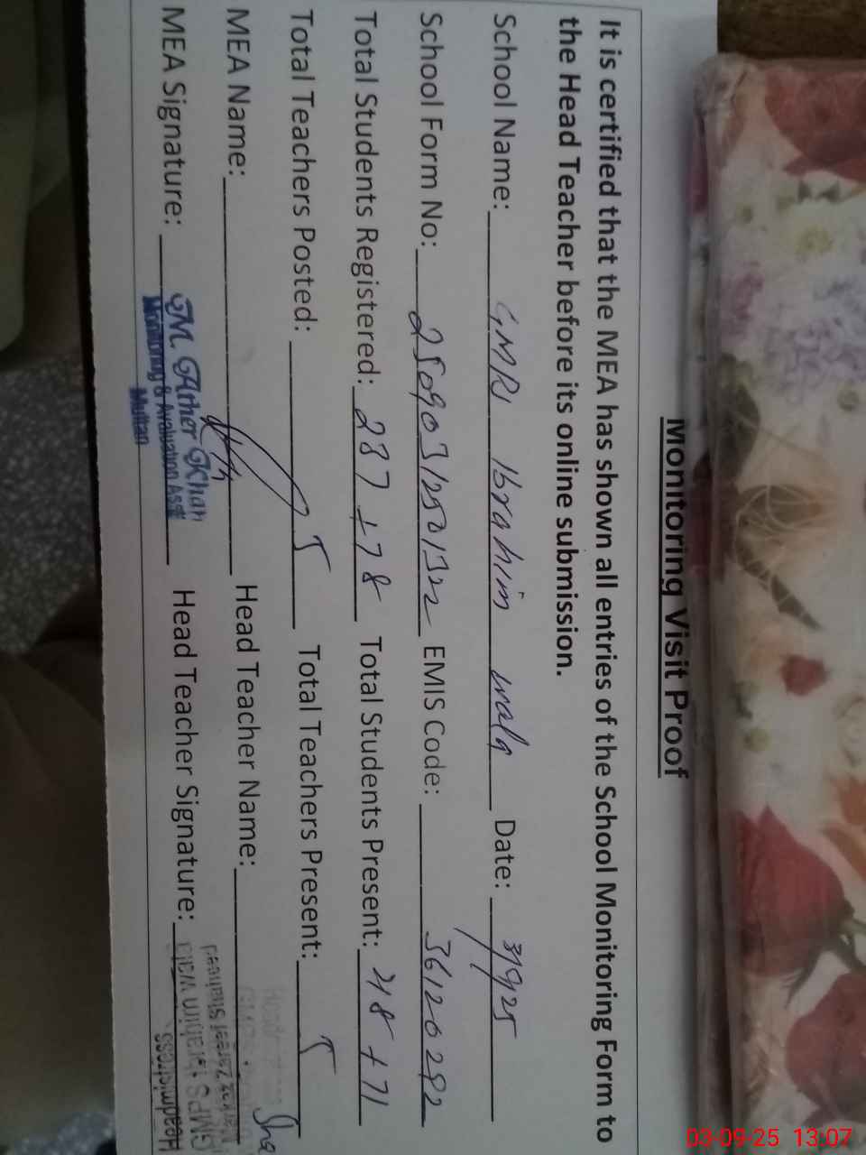 | Attendance Register | Head Teacher | MEA with School | Visit Proof |