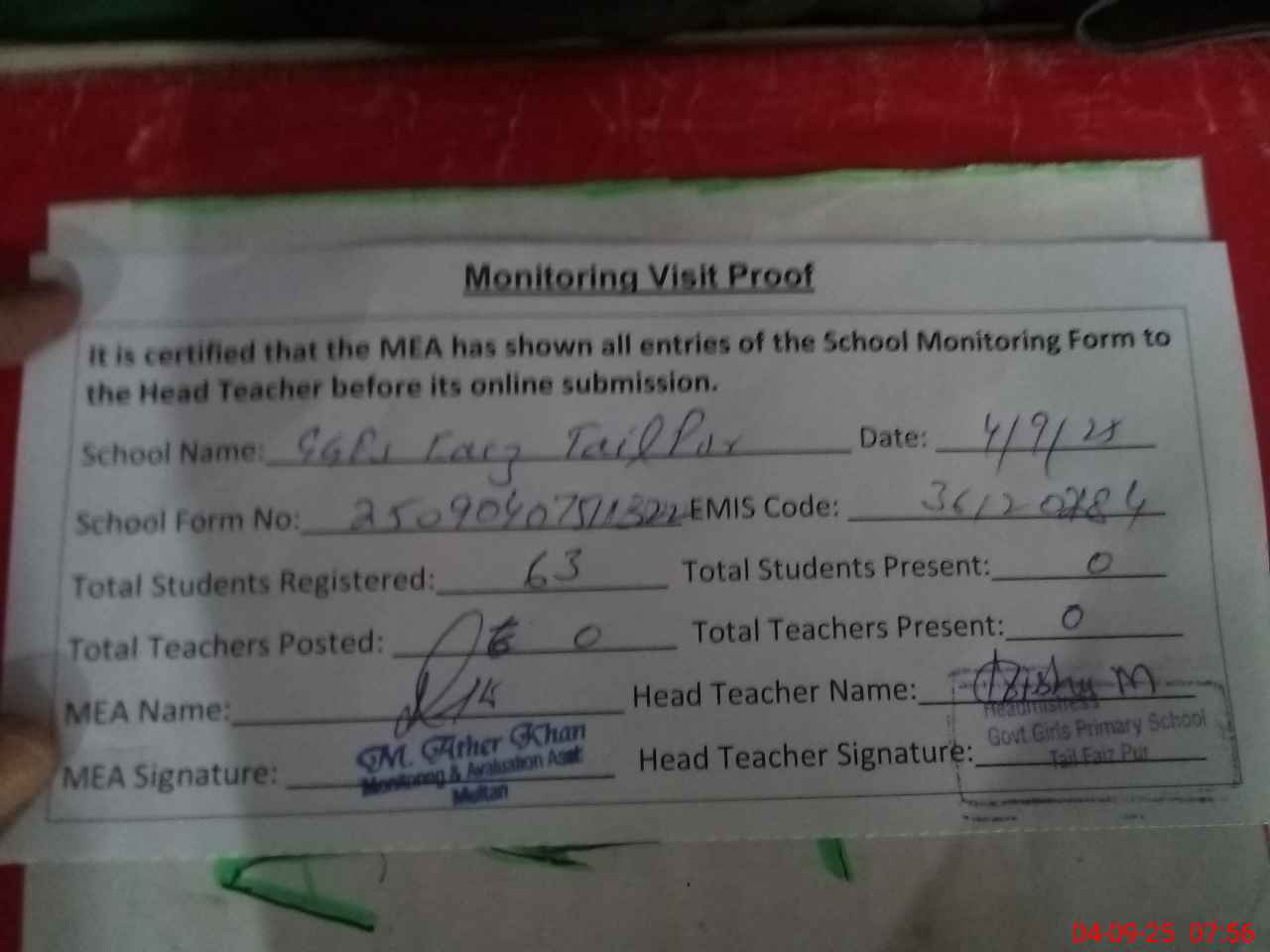 | EMIS Code: 36120284 | Name of School: GGPS TAILL FAIZ PUR SHUJABAD | |||