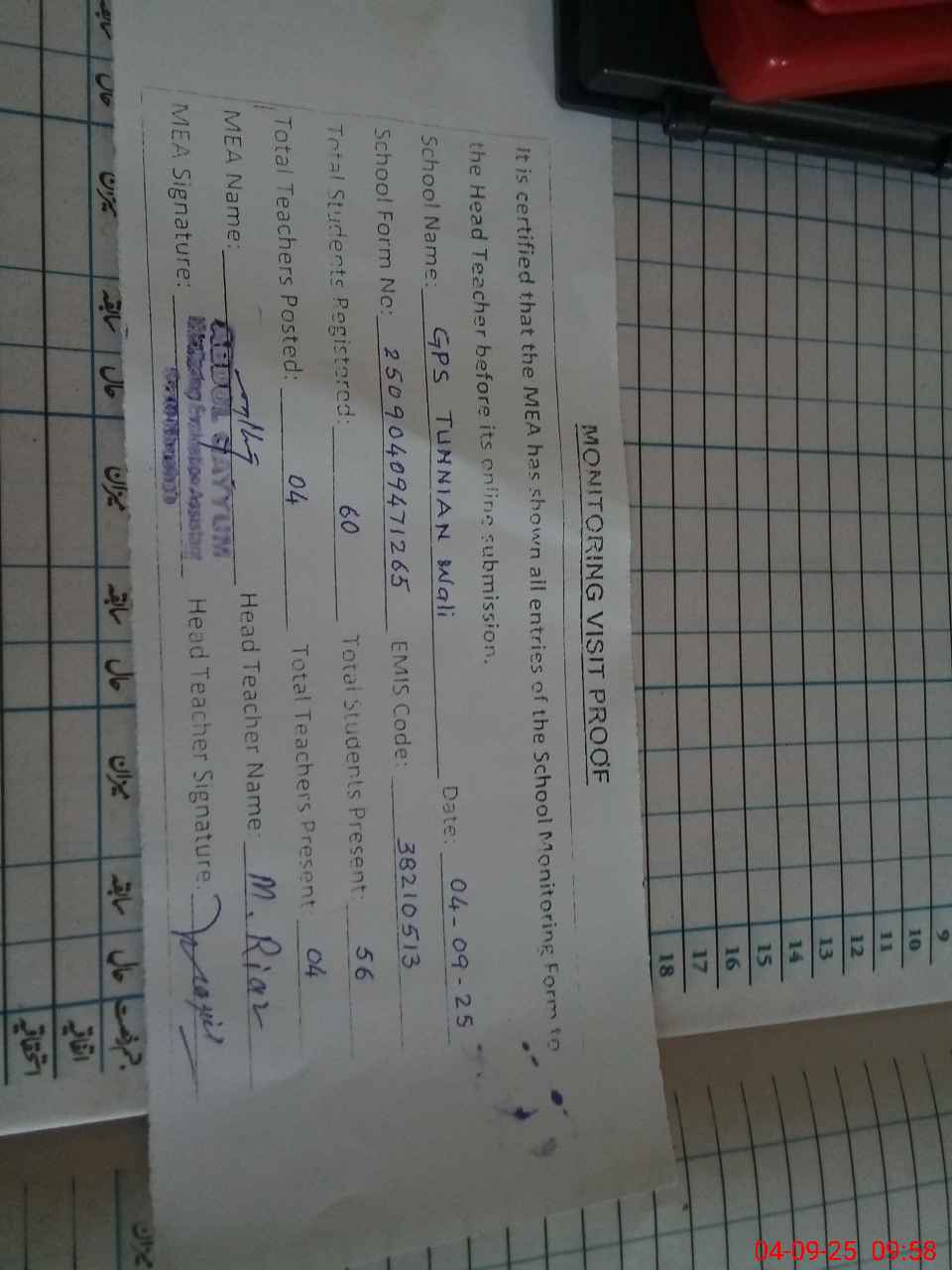 | Attendance Register | Head Teacher | MEA with School | Visit Proof |