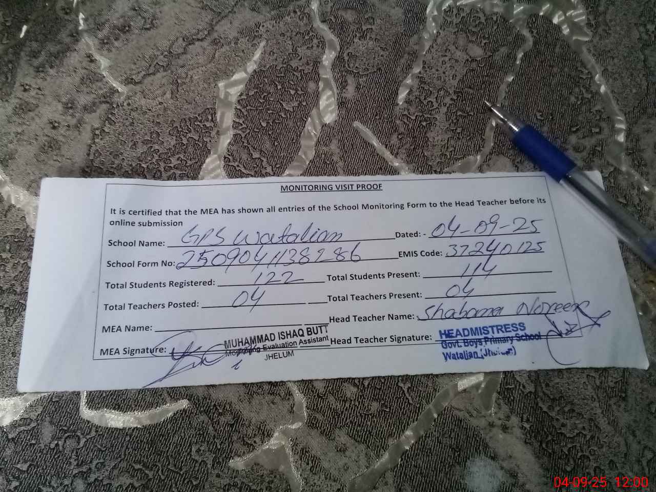 | Attendance Register | Head Teacher | MEA with School | Visit Proof |