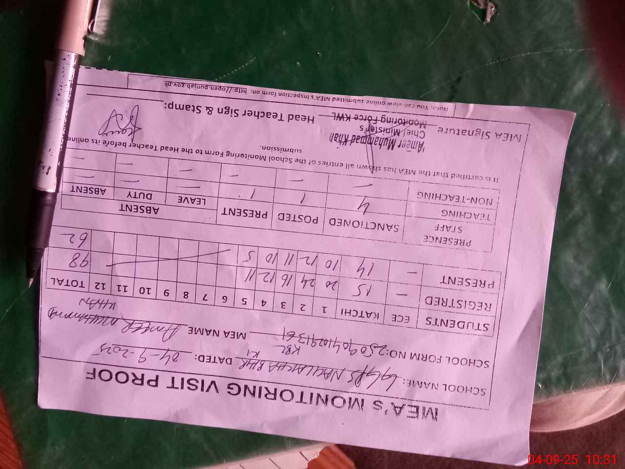 | Attendance Register | Head Teacher | MEA with School | Visit Proof |