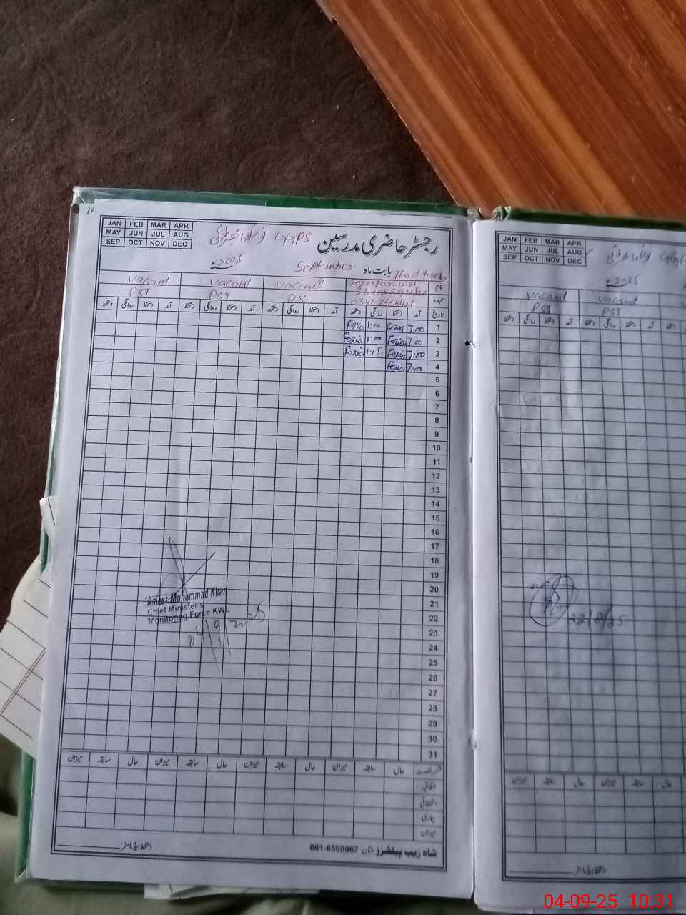 | CNIC | Full Name | Designation | R/C | Absence During Last Calender Month |