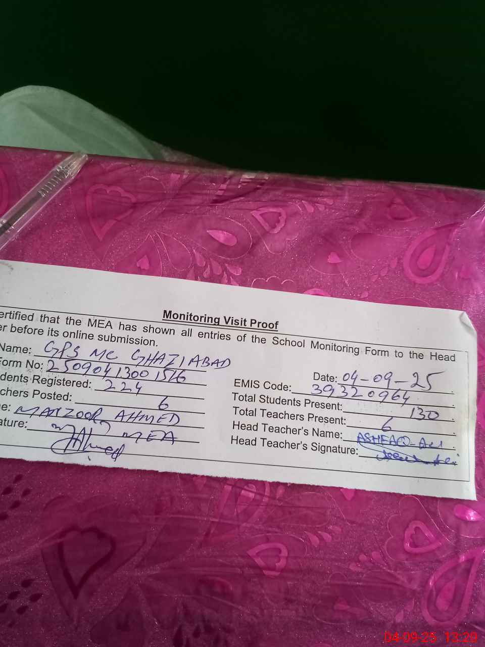 | Attendance Register | Head Teacher | MEA with School | Visit Proof |