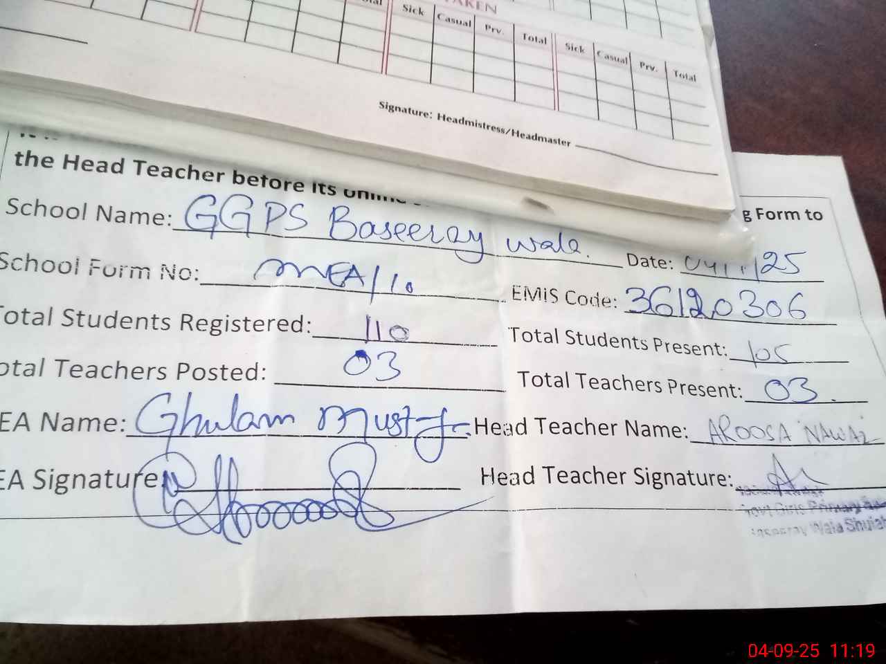 | Attendance Register | Head Teacher | MEA with School | Visit Proof |