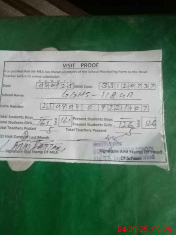 | EMIS Code: 33120737 | Name of School: GGHS CHAK 118 GB | |||