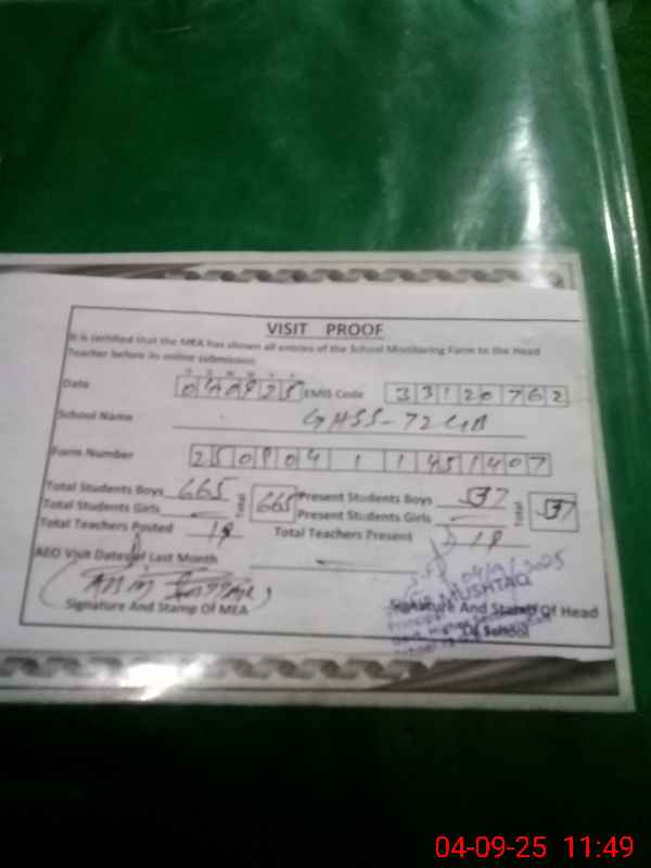 | EMIS Code: 33120762 | Name of School: GHSS CHAK NO. 72/GB | |||