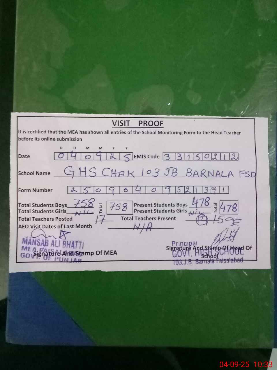 | EMIS Code: 33150212 | Name of School: GHS CHAK 103 JB BARNALA FSD | |||
