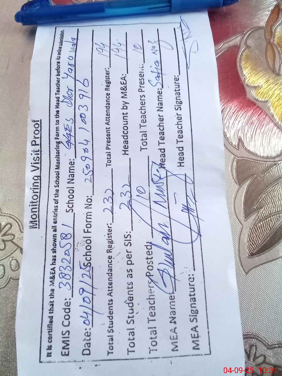 | Attendance Register | Head Teacher | MEA with School | Visit Proof |