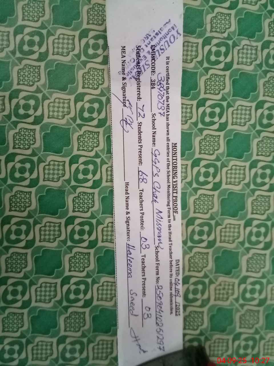 | Name: HA**** SA**** Designation: (School Headmaster's/Headmistress's) PST Phone/Cell Number: 03**** |