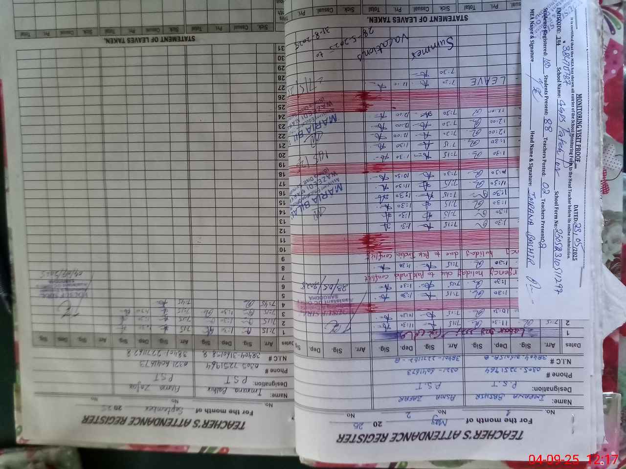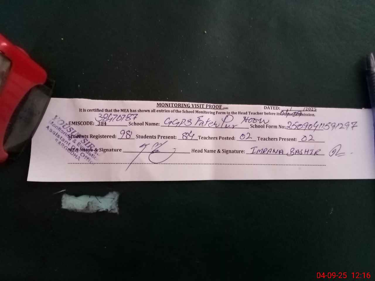 | Attendance Register | Head Teacher | MEA with School | Visit Proof |