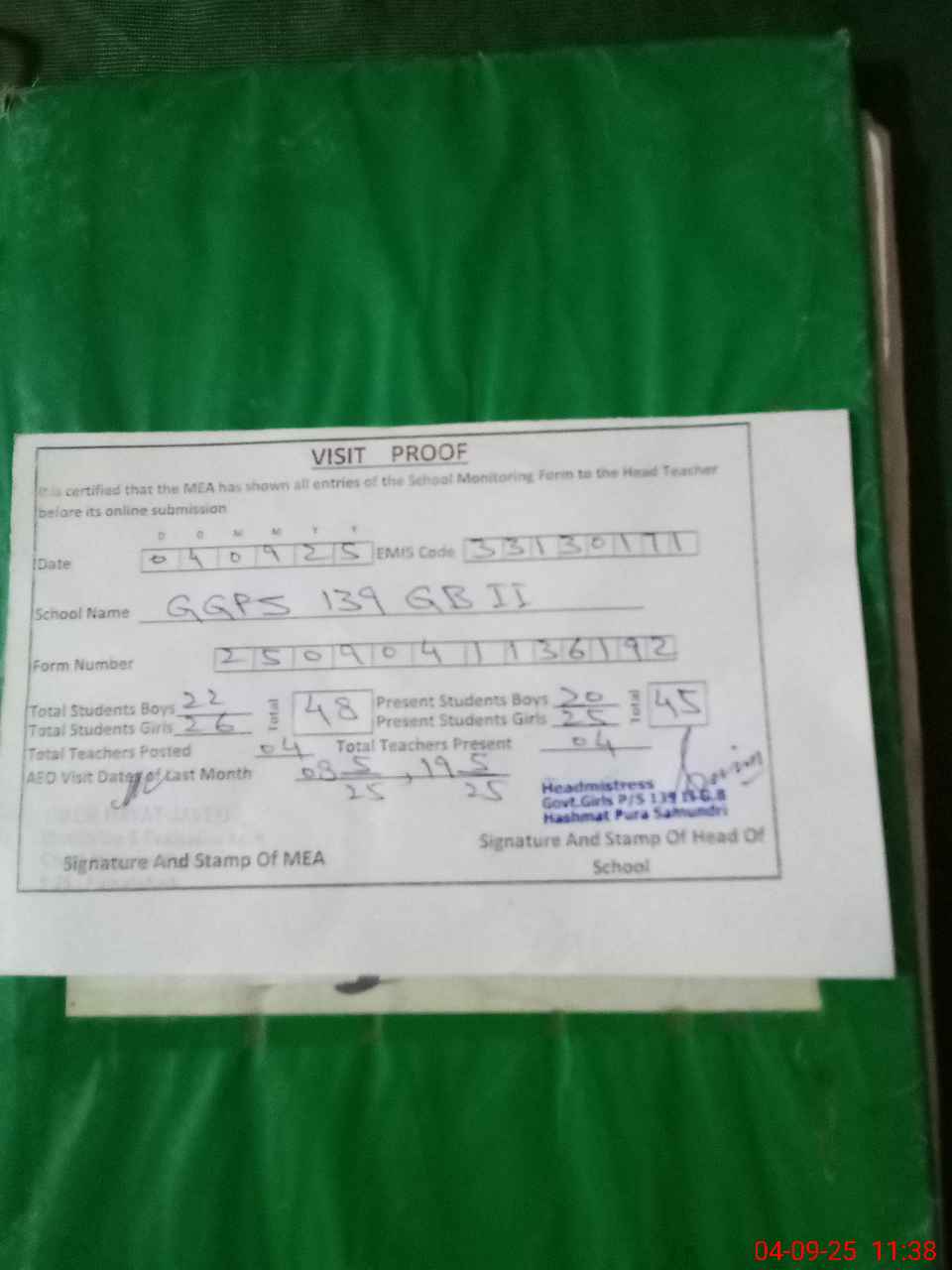 | EMIS Code: 33130171 | Name of School: GGPS CHAK 139 GB II HASHMAT PURA SAMUNDRI | |||