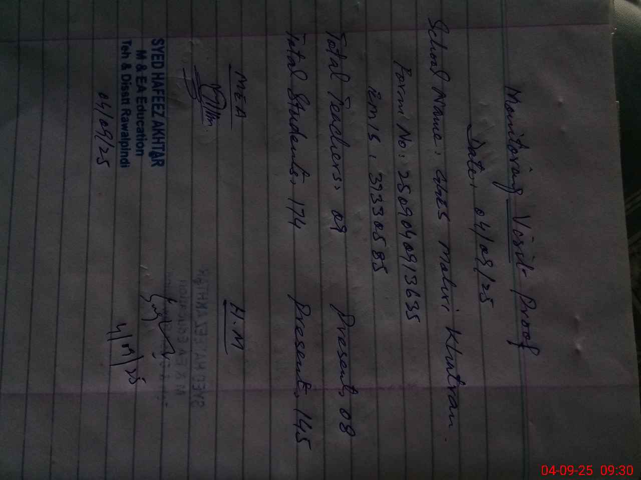 | Monitoring Date: 04-09-2025 | Start Time: 04-09-2025 08:54 AM | End Time: 04-09-2025 09:34 AM | Name of MEA: Sy**** Ha**** Ak**** | |