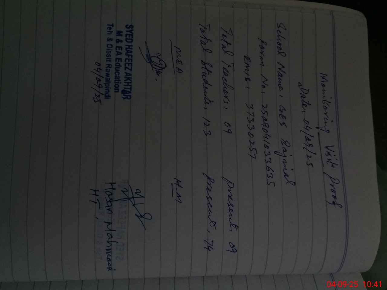 | Attendance Register | Head Teacher | MEA with School | Visit Proof |
