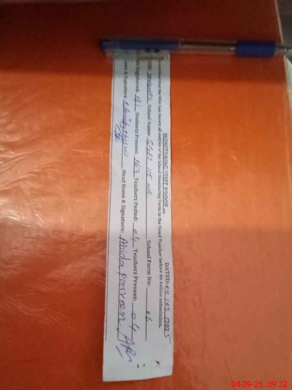 | Attendance Register | Head Teacher | MEA with School | Visit Proof |