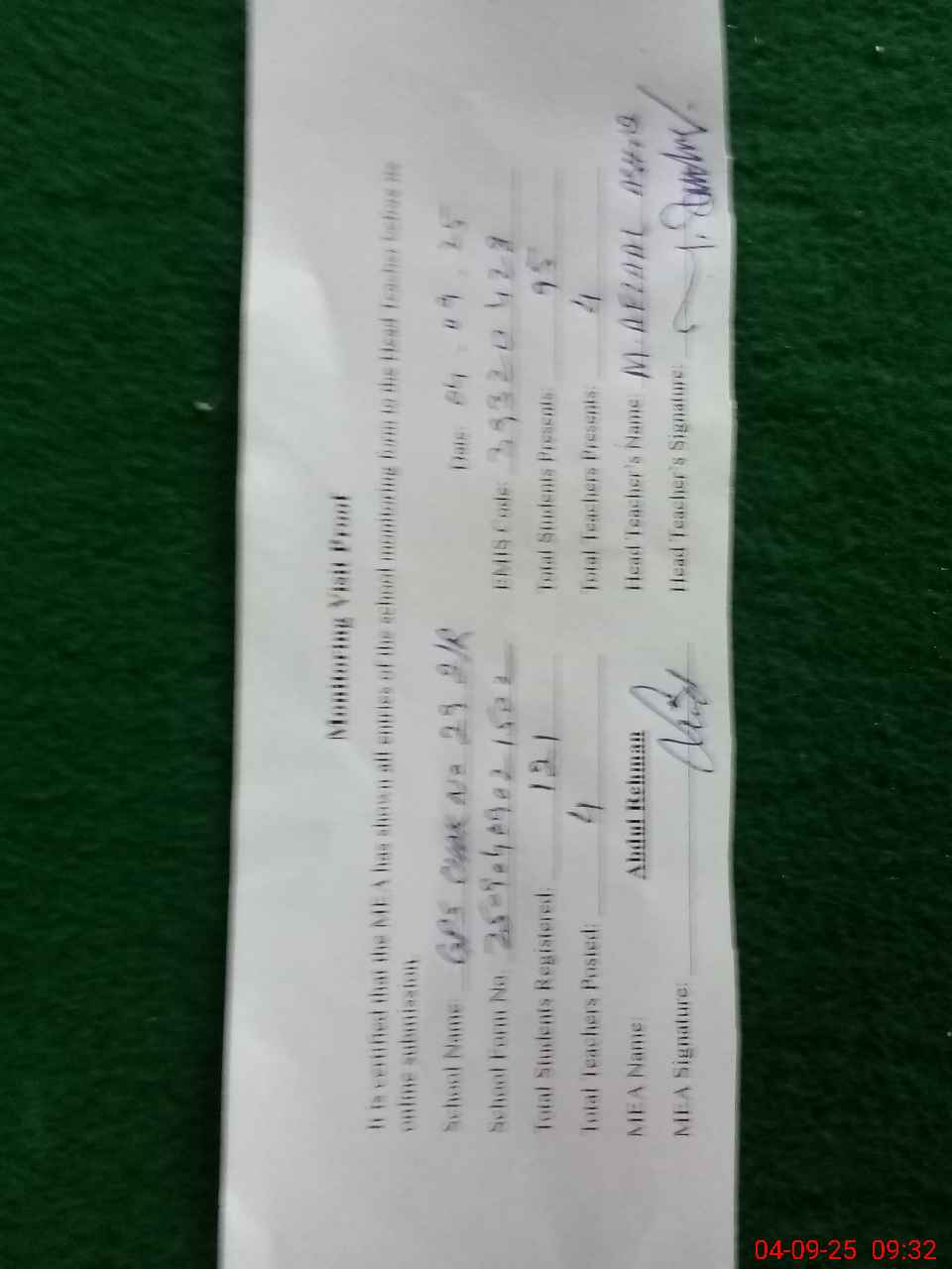 | Attendance Register | Head Teacher | MEA with School | Visit Proof |