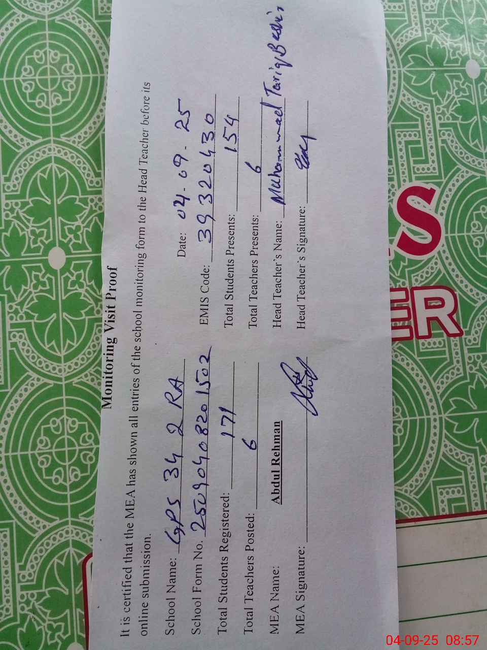 | Attendance Register | Head Teacher | MEA with School | Visit Proof |