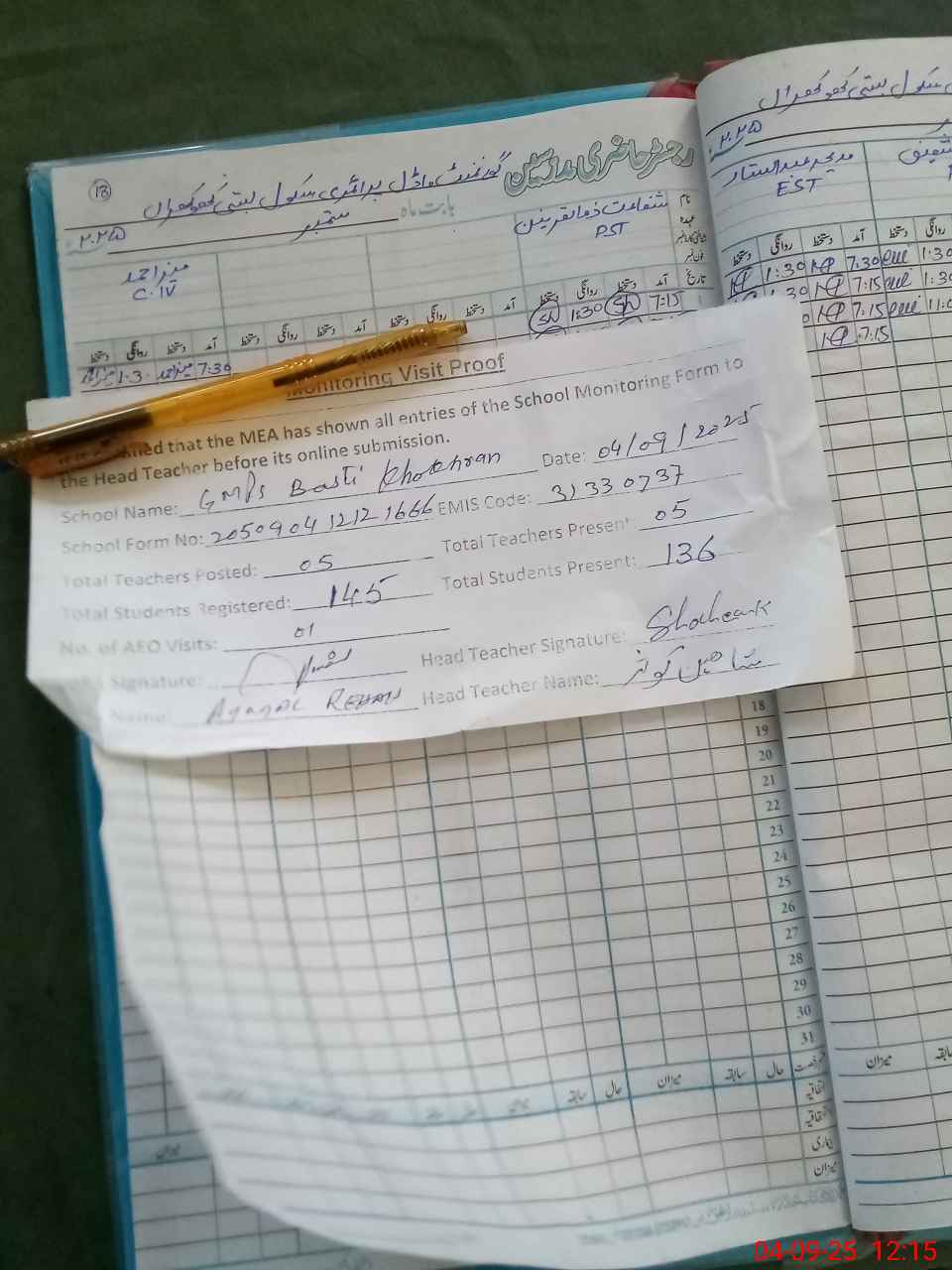 | Attendance Register | Head Teacher | MEA with School | Visit Proof |