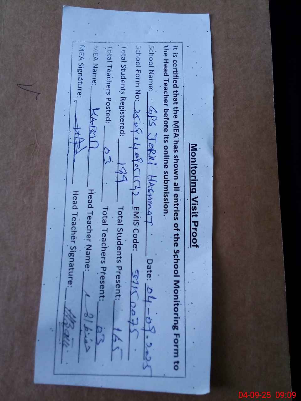 | EMIS Code: 31150075 | Name of School: GPS JORKI HASHMAT | |||