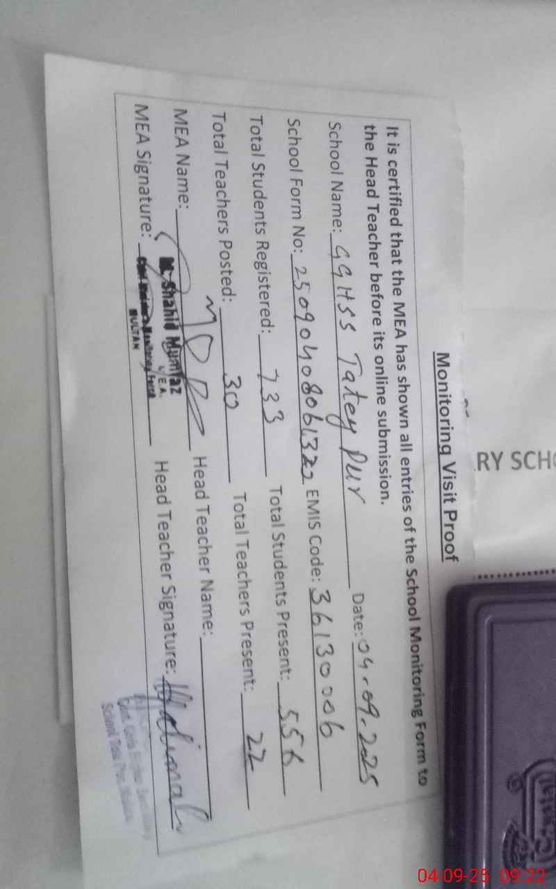| EMIS Code: 36130006 | Name of School: GGHSS TATEY PUR | |||